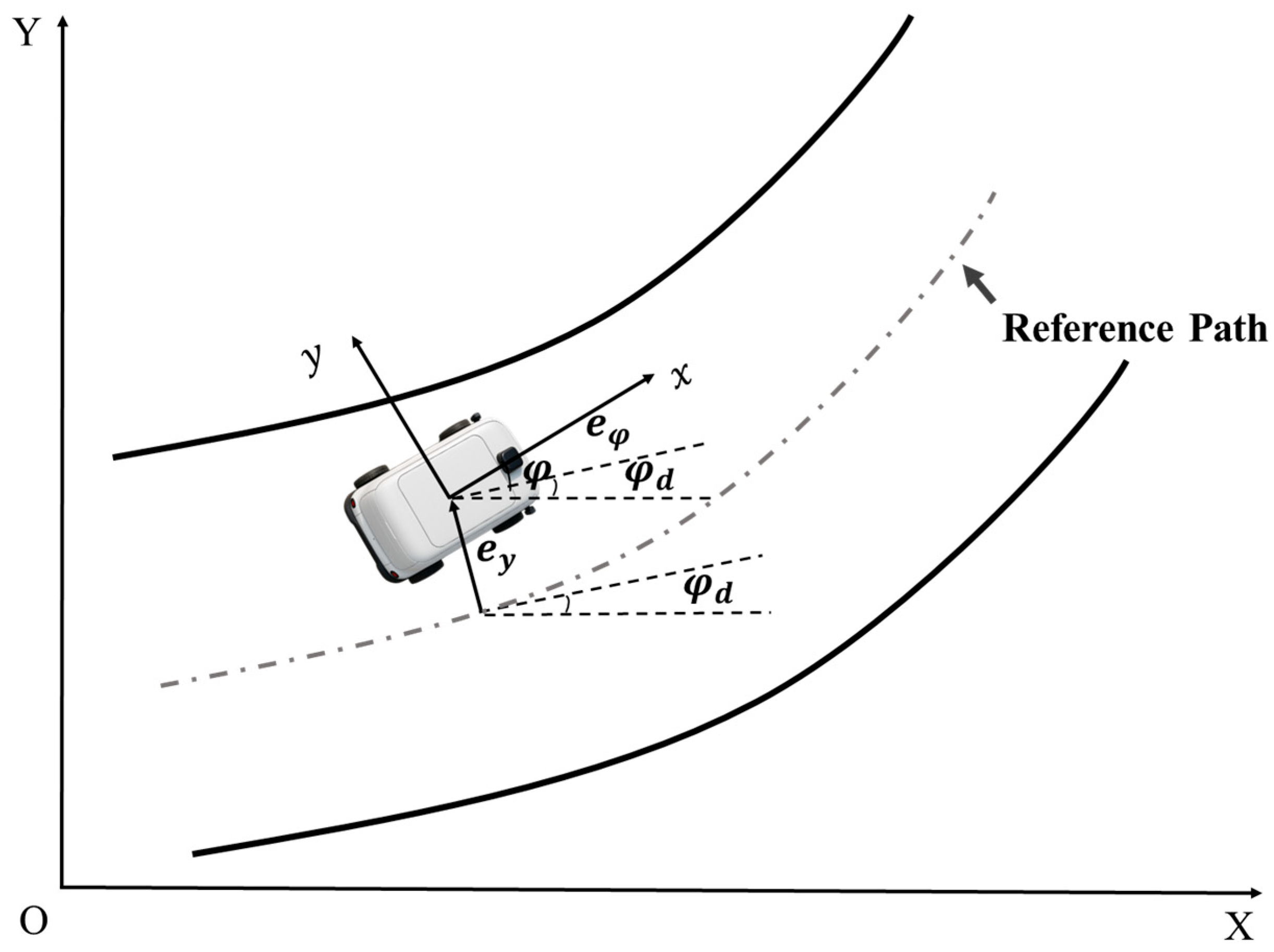 ). The heading angle error quantifies the orientation difference between the vehicle’s current heading and the desired heading. Concurrently, the lateral position error represents the displacement of the vehicle’s center of gravity from the reference trajectory. The geometric relationship between these errors is illustrated in