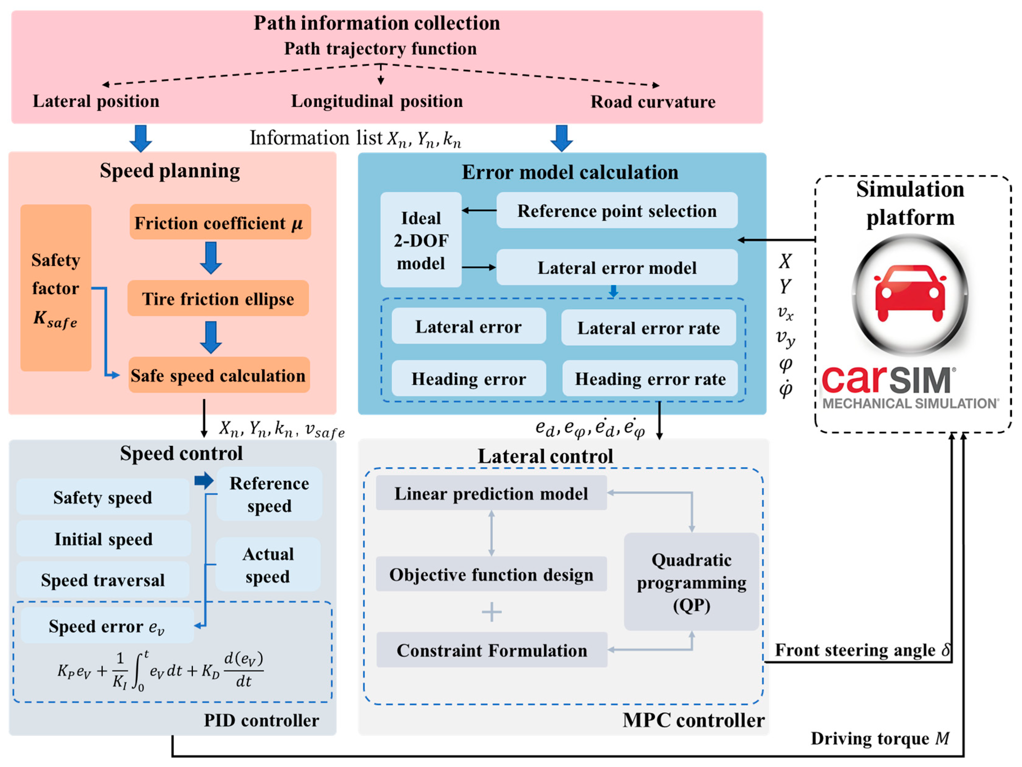 This paper establishes a tracking error model based on vehicle dynamics, which integrates the lateral position error and heading angle error into a unified state-space representation. An integrated control framework that combines velocity control with lateral path tracking control is also proposed. The speed controller, based on PID theory, achieves adaptive speed regulation by considering road curvature and the road adhesion coefficient. The lateral controller employs a MPC approach to achieve optimal control of the front wheel steering angle by minimizing lateral position and heading angle deviations. This study first establishes a tracking error model based on vehicle dynamics, integrating the lateral position error and heading angle error into a unified state space representation. On this basis, an integrated control framework is proposed. Unlike traditional fixed-speed schemes that may fail due to tire force saturation in high curvature or low adhesion conditions, this paper does not have the lateral MPC passively deal with extreme bends or low-adhesion road surfaces alone. Instead, a PID speed controller is introduced, combined with road curvature and adhesion coefficient for forward-looking and adaptive speed regulation, ensuring that the vehicle is within the safety margin of the friction limit before entering the bend. Subsequently, the lateral MPC, under the constraints of actuators and friction, optimizes the steering angle of the front wheels by minimizing the lateral deviation and heading deviation, achieving high-precision path tracking and lateral stability.