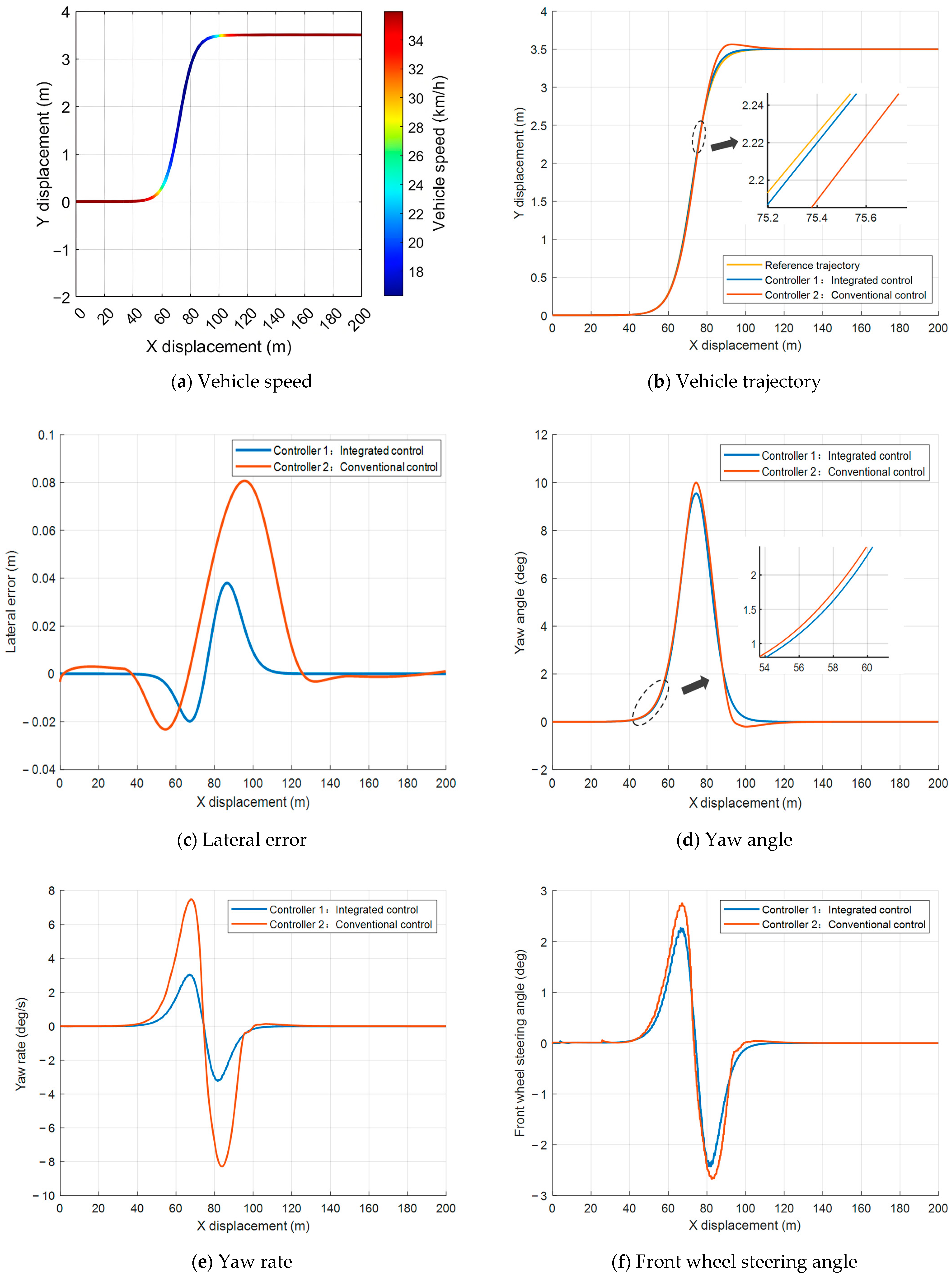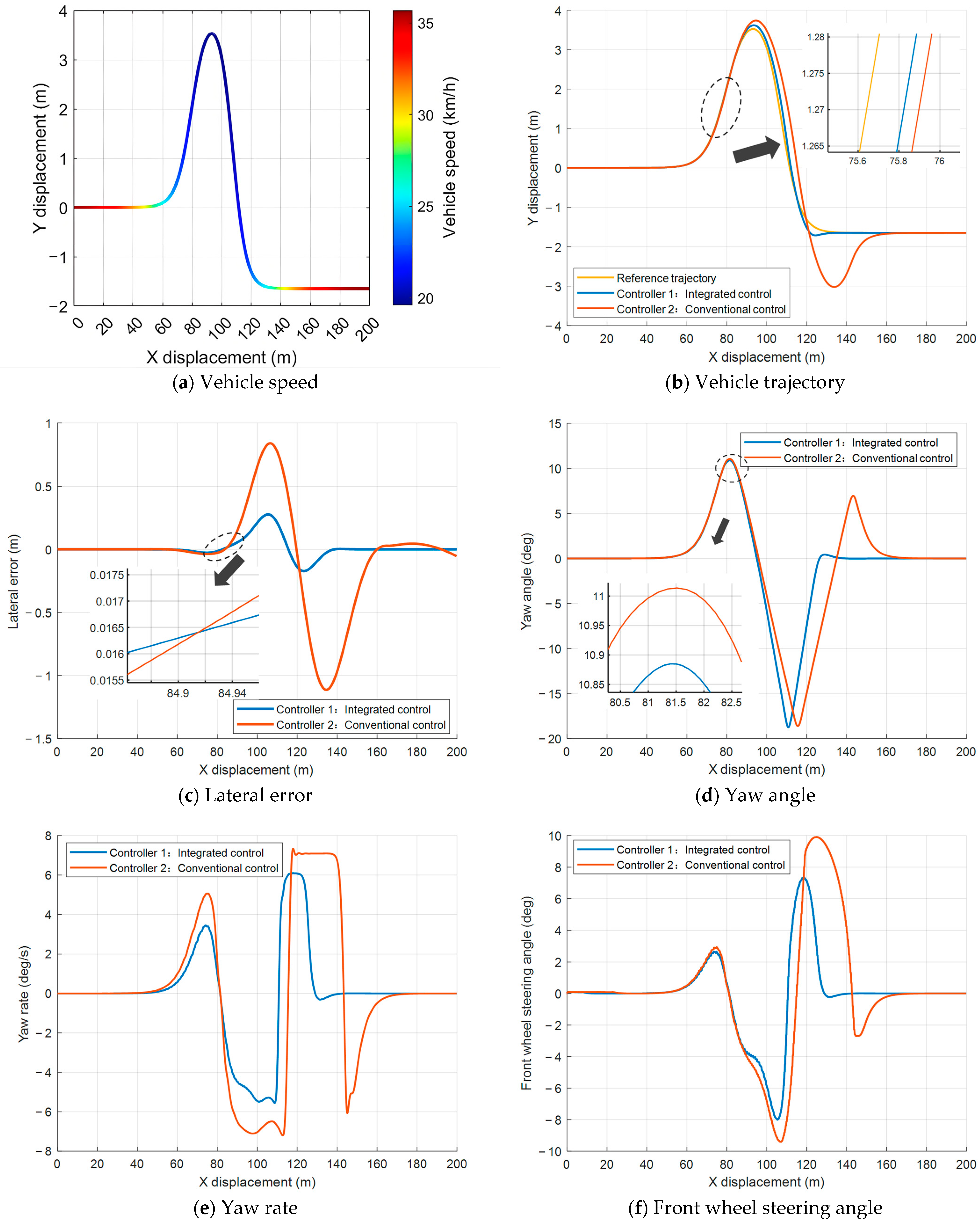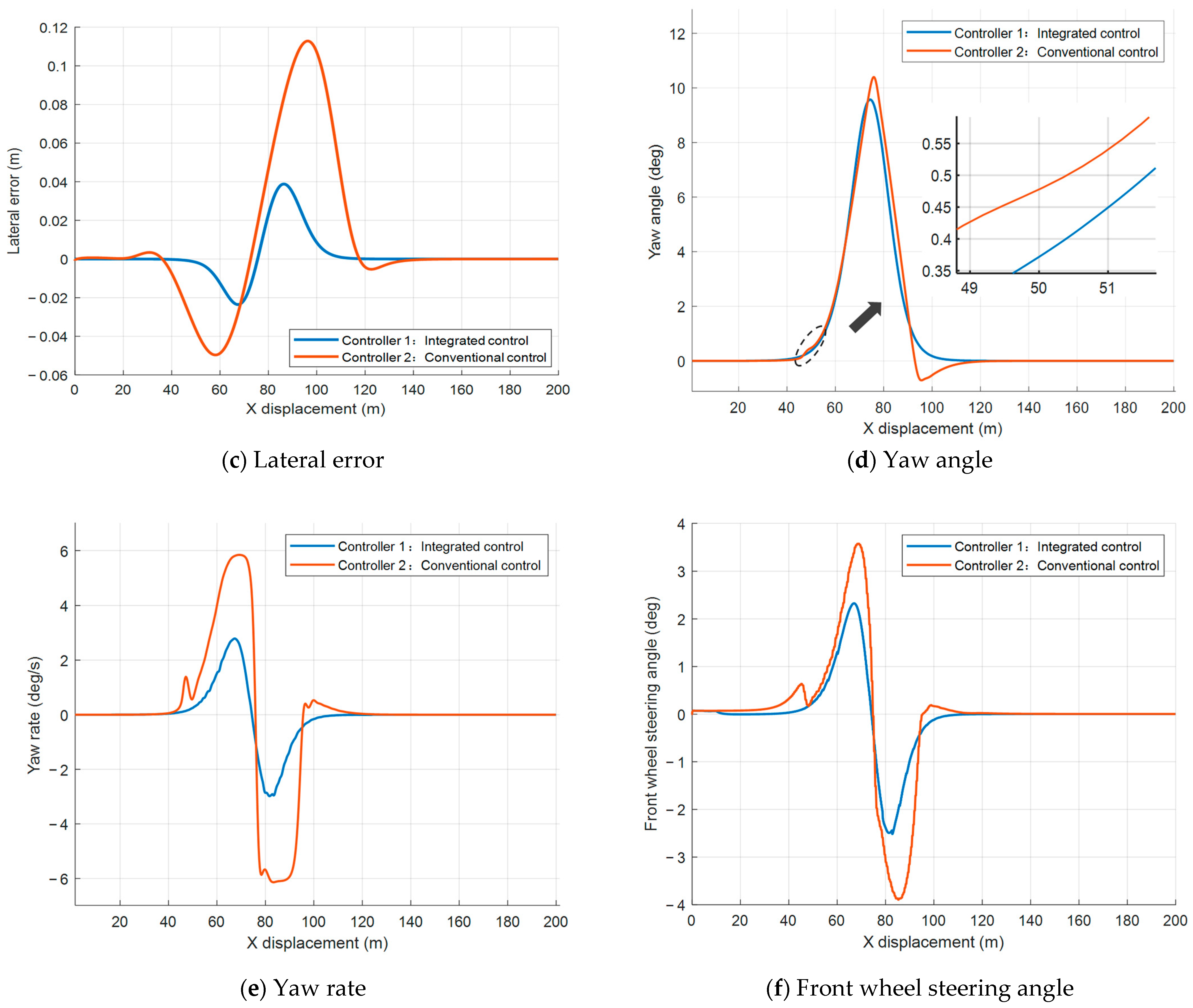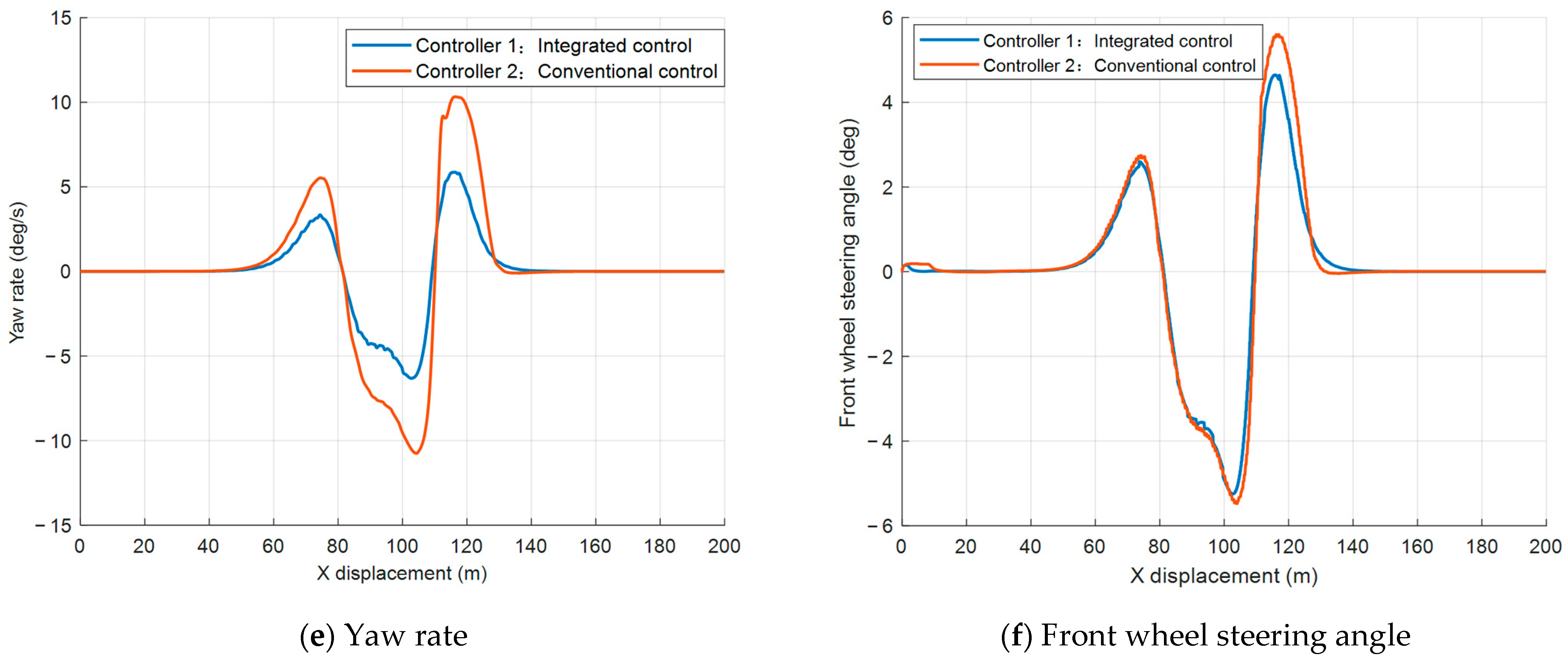 Figure 7d), it can be observed that, during sharp turns, the conventional controller produces a peak heading angle of approximately 10 deg, whereas the integrated controller achieves a lower peak with a smoother response curve. The lateral yaw rate trend (
