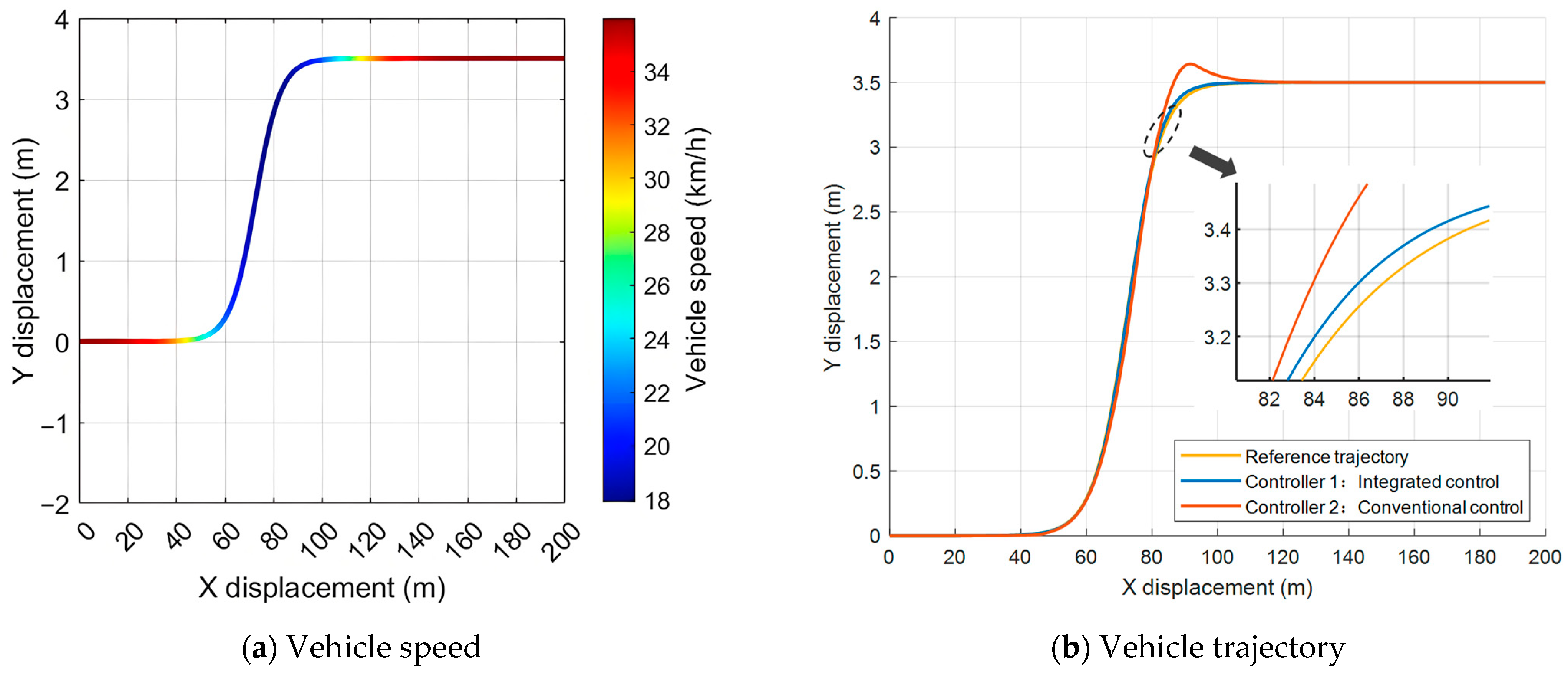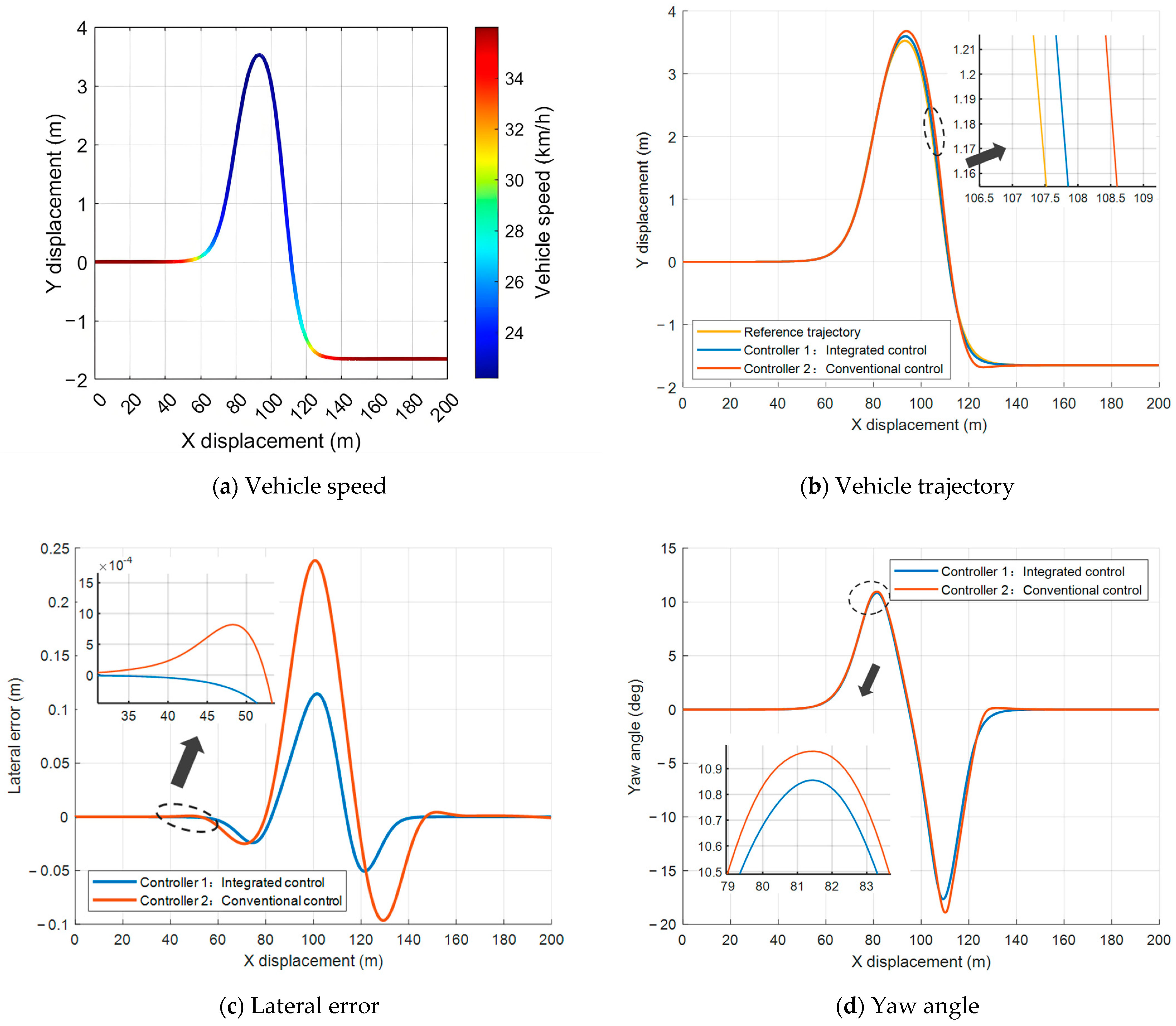 Figure 7b) clearly highlights the difference between the two controllers in sections with severe path curvature changes (lateral position 60–90 m). The conventional controller exhibits notable overshoot after steering maneuvers, causing the vehicle to deviate laterally from the reference path, with a maximum lateral error reaching 0.08 m. In contrast, the proposed integrated controller closely follows the target path with minimal overshoot, reducing the maximum lateral error to 0.04 m, which represents an improvement of nearly 40% and thus validates its superior path tracking capability (