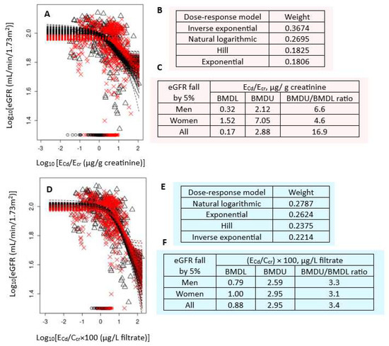 For Ccr-adjusted datasets, the weights for the natural logarithmic model (0.2787) and the exponential model (0.2624) were close (Figure 1E). In all subjects, (ECd/Ccr) × 100 of 0.88 µg/L filtrate (Figure 1F) produced a 5% reduction in eGFR. BMDL value of (ECd/Ccr) × 100 for the same BMR was only 21% higher in women compared to men (0.79 vs. 1 µg/L filtrate) (Figure 1F). The BMDU/BMDL ratio for the Ccr-based benchmark was 3.4. This indicated a higher degree of certainty, compared to the Ecr-based BMD estimates.