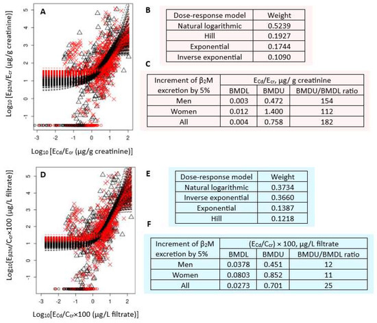 Equivalent quantal BMD modeling for prevalences of abnormal Eβ2M excretion values were conducted using two additional cut-off values: ≥100 and ≥1000 µg/g cr for Ecr-adjusted datasets and ≥100 and ≥1000 µg/L filtrate for Ccr-adjusted datasets. Full results are provided in Figures S1 and S2. Urinary Cd excretion benchmarks estimated from these cut-off values are displayed in Table 4 together with those reported in Figure 3E,F and Figure 4E,F.