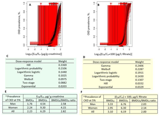 Figure 3 presents the quantal BMD modeling of two CKD prevalence/ECd datasets, including bootstrap model averaging curves (Figure 3A,B), model weights (Figure 3C,D), and BMDU/BMDL values of ECd (Figure 3E,F).