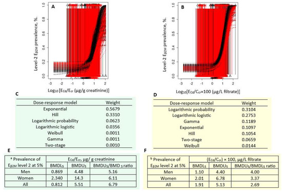 For the Ecr-adjusted datasets, the weight of the exponential model (0.5679) was the highest, followed by the Hill model (0.3310) (Figure 4C). Respective ECd/Ecr benchmarks for a 5% prevalence of Eβ2M/Ecr values ≥ 300 µg/g cr in men, women, and all subjects were 0.869, 2.340, and 0.812 µg/g cr (Figure 4E). The uncertainty indices for the ECd/Ecr benchmark estimates were 4, 14.3, and 5.51 for men, women, and all subjects, respectively.