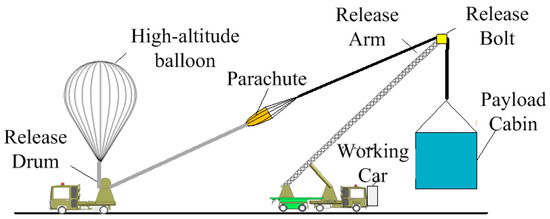 In these scientific campaigns, the flight system typically comprised a high-altitude balloon, a parachute assembly, and a payload cabin, as illustrated schematically in Figure 1. The balloon is initially inflated with helium, with the required volume determined by the total payload mass and the target flight altitude. Following release, the parachute is deployed simultaneously. To mitigate the effects of wind shear between the ground and upper atmosphere, the payload cabin is secured to a release vehicle, which orients the cabin into the wind and imparts an appropriate release velocity. Upon reaching the target altitude, the balloon initiates level flight, the duration of which is dictated by mission requirements and ambient conditions. Mission termination is executed via a ground-commanded separation signal, severing the connection between the balloon and the payload cabin. The balloon then ascends further and ruptures autonomously, while the payload cabin descends under gravity, with the parachute deploying to ensure a controlled landing.