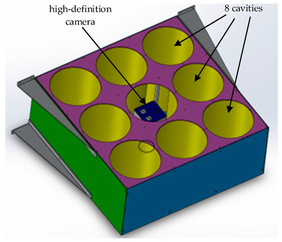 The HH-19-6 experiment was designed to simulate meteorite landings, supporting the analysis of organism survival in the near-space environment and the assessment of impact effects on potential life forms carried within meteorites [9]. This experiment utilized the near-space balloon platform to investigate the plausibility of interstellar (or interplanetary) panspermia by replicating the meteorite entry and Earth impact process. The mechanical design of the simulated meteorite ejection system is depicted in Figure 2; the system contains 8 cavities for storing simulated meteorites and a central cavity for installing a high-definition camera (resolution: 1920 × 1080 pixels, frame rate: 30 fps) to record the release process.