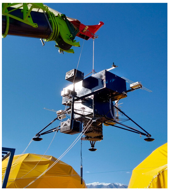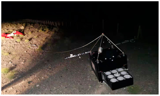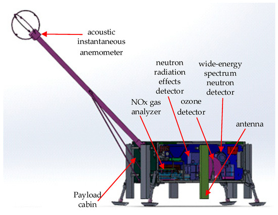 The mechanical design of the HH-19-7 payload cabin, illustrating the integration of all experimental payloads, is shown in Figure 4. The physical implementation of the HH-19-7 experiment system is presented in Figure 5, comprising two primary sections: an upper flight control cabin and a lower payload cabin. The flight control cabin’s functions included real-time monitoring of balloon position and attitude, flight altitude control, execution of the balloon–cabin separation command, and broadcasting of cabin position information post-landing. The payload cabin provided a controlled environment for the scientific instruments, furnishing power, data storage, data transmission, status monitoring, and video surveillance capabilities. The attitude accuracy of roll/pitch was 0.1°, the attitude accuracy of heading was 0.5°, the temperature in the payload cabin during the daytime ranged from 10 to 30 °C, and the outside temperature was −50 °C [13].