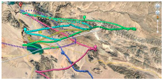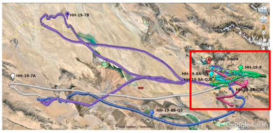 The flight trajectories for all eight experiments are plotted in Figure 10. The landing sites were primarily clustered into two geographical areas. Missions with longer durations (HH-19-7A, HH-19-7B, and HH-19-8B-Q5, all exceeding 10 h) resulted in landing points significantly distant from the launch site. The shorter-duration missions exhibited more concentrated landing patterns, as detailed in the close-up view in Figure 11.
