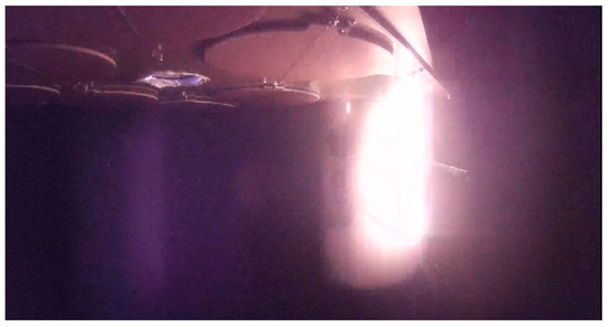 Upon reaching the target altitude of 8 km, the ground console issued the ejection command, triggering the sequential release of the simulated meteorites according to the pre-programmed sequence. The ejection mechanism utilized a nickel–chromium alloy wire securing the ejection cabin’s baseplate. Applying electrical current heated and subsequently melted the wire, causing the baseplate to open and release the simulated meteorite. The cabin door opening process is captured in Figure 13.