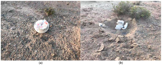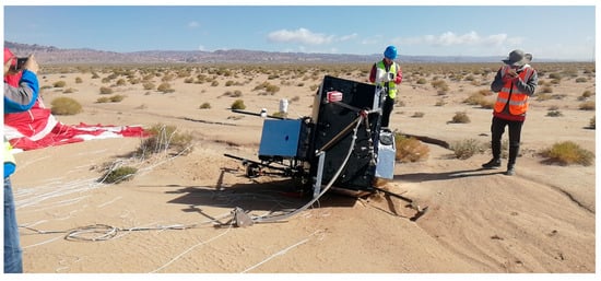 After the experiment, the flight control cabin was separated from the balloon and descended safely under parachute. The landing site was fortuitously located near an access road, facilitating recovery, as shown in Figure 14. The simulated meteorites were successfully located using their transmitted positional data. As shown in Figure 15, several meteorites sustained significant fragmentation upon impact due to the high kinetic energy.
