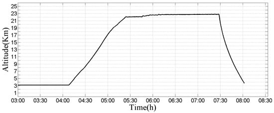 The HH-19-7A experiment was conducted on 23 July. Operations commenced at 05:15 local time, with balloon launch occurring at 06:45, as captured by a ground camera and shown in Figure 16. The balloon achieved the target altitude of approximately 21.6 km after a 65 min ascent. It maintained level flight above 20 km for approximately 10 h before initiating descent. Following a brief period of level flight between 16 km and 17 km, the balloon–payload connection was severed. The balloon continued ascending until its rupture, while the payload cabin descended under gravity, with the parachute deploying to decelerate the descent.
