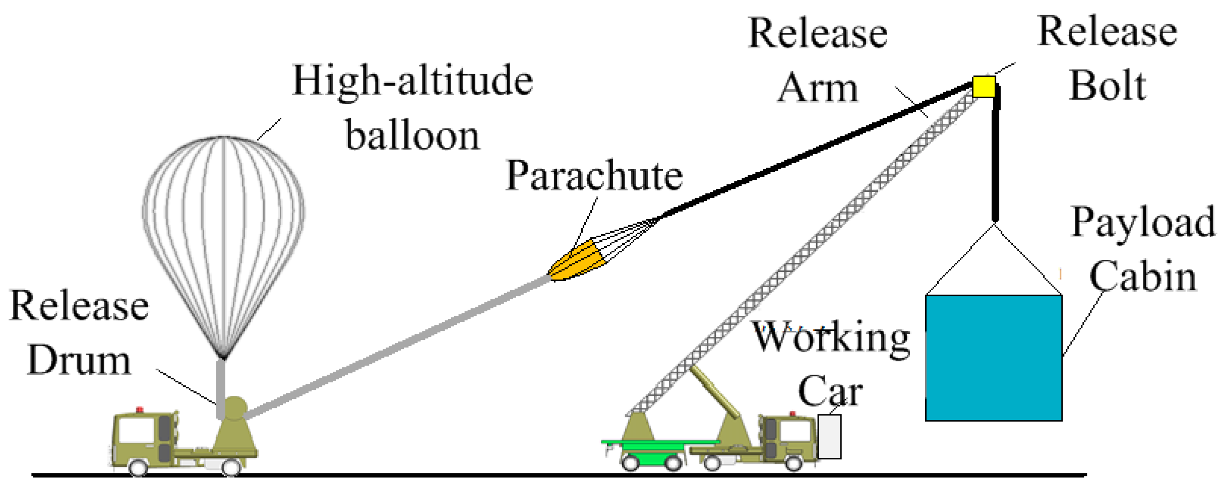 Figure 1. The balloon is initially inflated with helium, with the required volume determined by the total payload mass and the target flight altitude. Following release, the parachute is deployed simultaneously. To mitigate the effects of wind shear between the ground and upper atmosphere, the payload cabin is secured to a release vehicle, which orients the cabin into the wind and imparts an appropriate release velocity. Upon reaching the target altitude, the balloon initiates level flight, the duration of which is dictated by mission requirements and ambient conditions. Mission termination is executed via a ground-commanded separation signal, severing the connection between the balloon and the payload cabin. The balloon then ascends further and ruptures autonomously, while the payload cabin descends under gravity, with the parachute deploying to ensure a controlled landing.