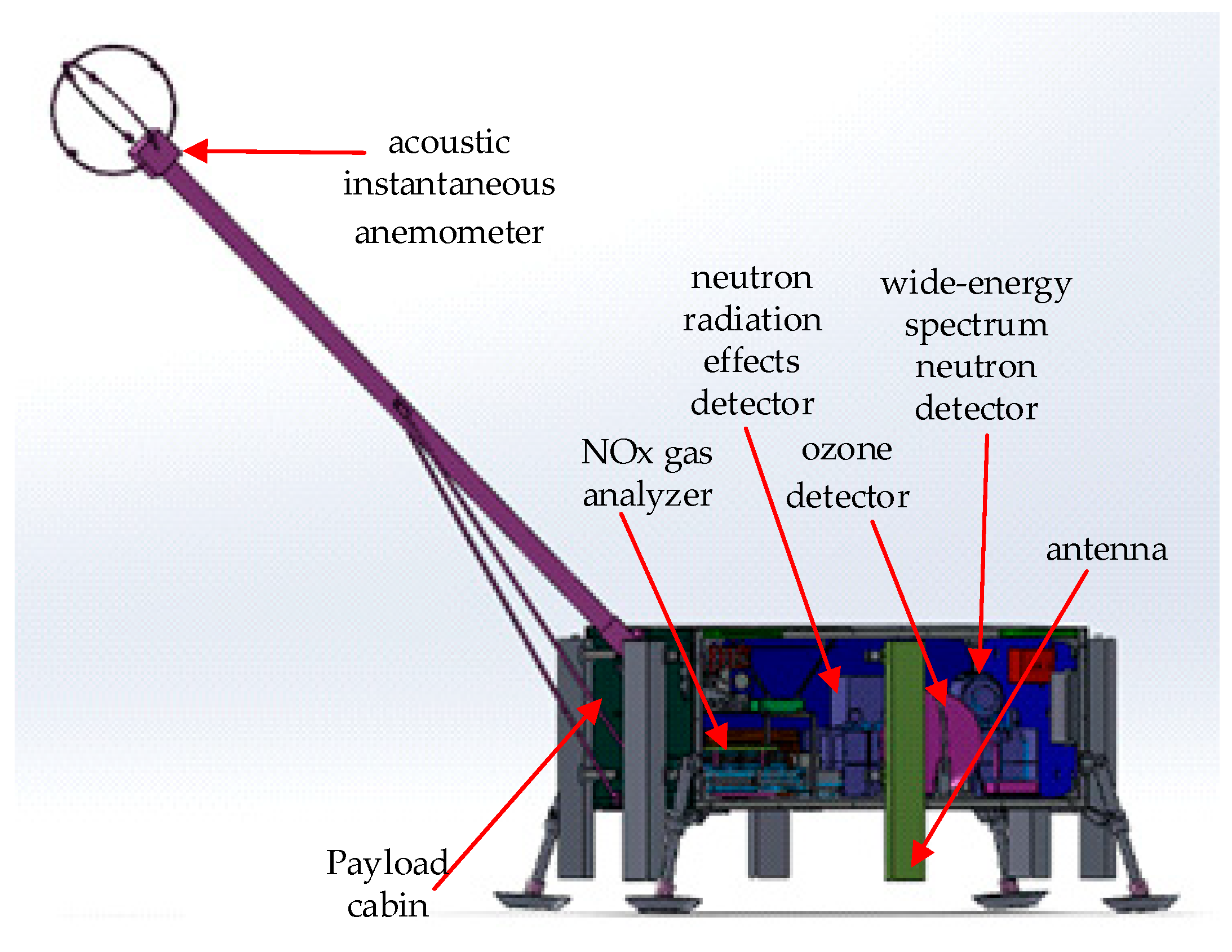 x gas analyzer, an ozone detector, and an acoustic instantaneous anemometer, among others. The mechanical design of the HH-19-8 payload cabin, showing the installation of all payloads, is depicted in