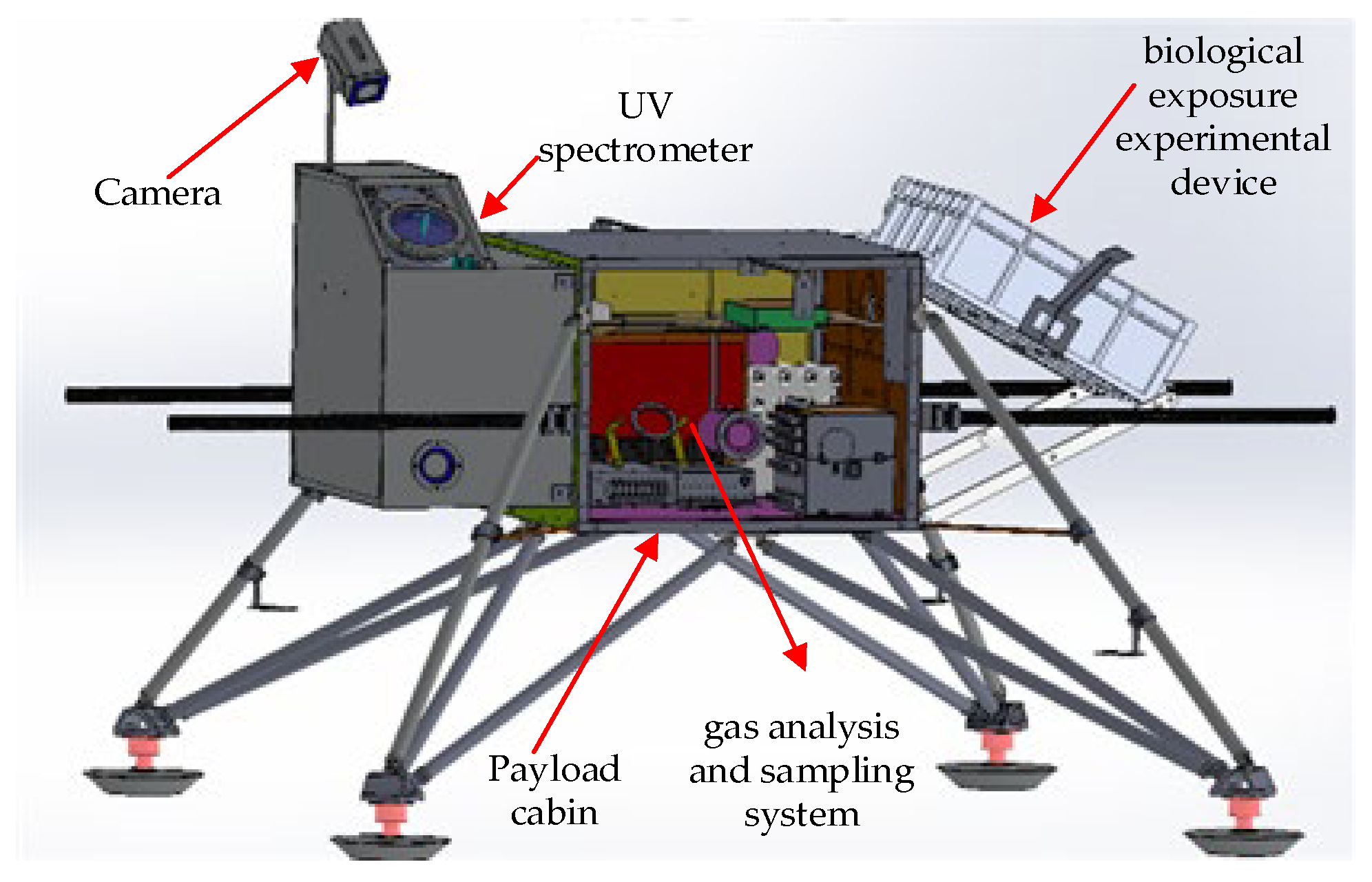 16]. HH-19-9 utilized a high-altitude balloon to transport a gas analysis and sampling system, a biological exposure experimental device, and a UV spectrometer into near space, focusing on atmospheric environment characterization, UV radiation measurement, and its impact on representative organisms. The mechanical design of the HH-19-9 payload cabin, illustrating the integrated payloads, is shown in