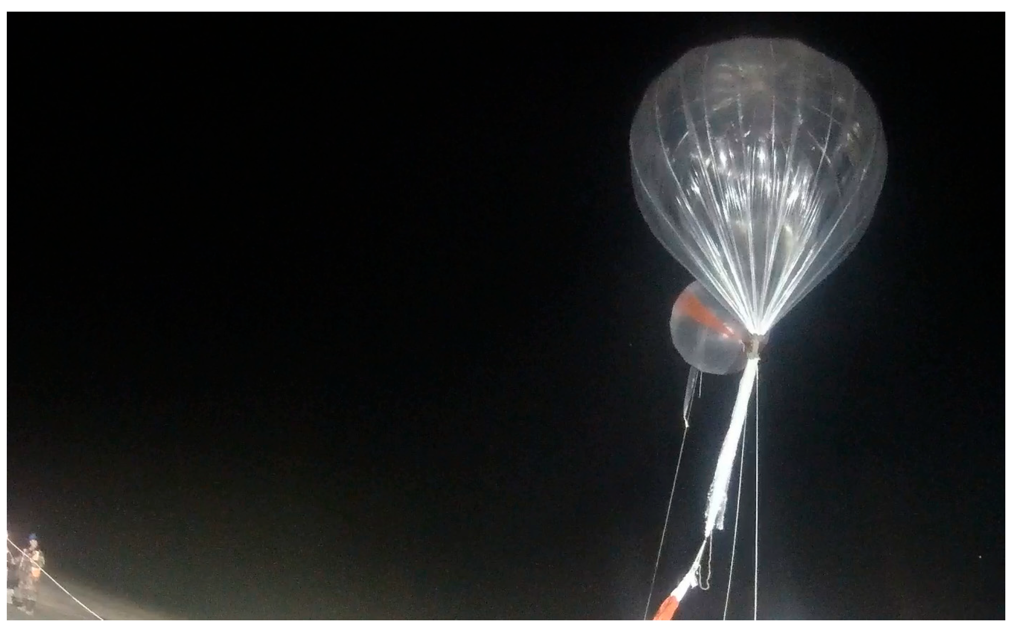 - Cai, R.; Yang, Y.C.; Jiang, L.H.; Zhang, T.H.; Xu, G.N.; Zhang, X.Q.; Zhou, J.H.; Miao, J.G.; Gong, Z.Q.; Wang, S.; et al. Research progress of High-altitude Scientific Balloons in Chinese Academy of Sciences. Natl. Remote Sens. Bull. 2025, 29, 1502–1514. [Google Scholar] [CrossRef]