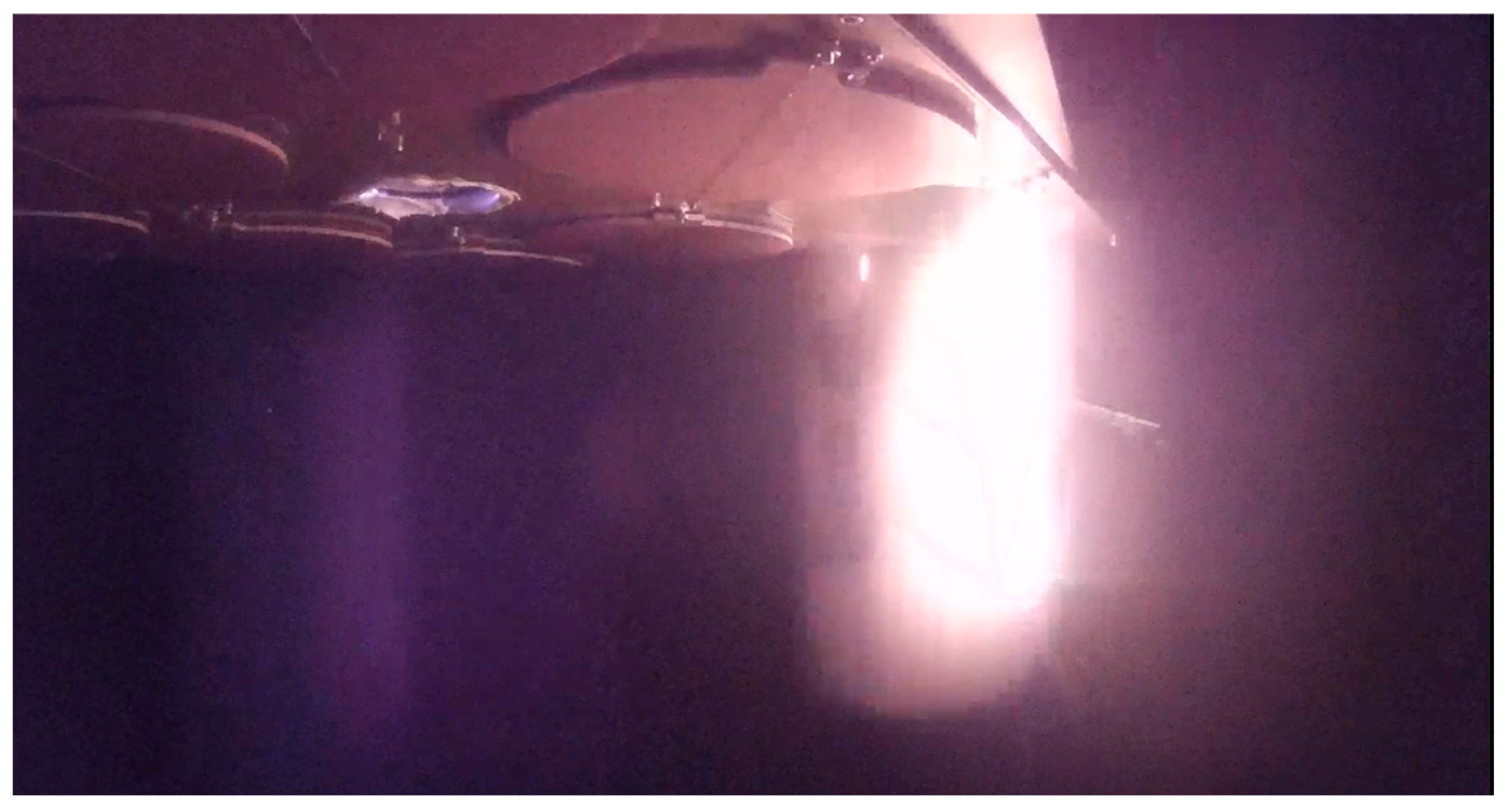 Upon reaching the target altitude of 8 km, the ground console issued the ejection command, triggering the sequential release of the simulated meteorites according to the pre-programmed sequence. The ejection mechanism utilized a nickel–chromium alloy wire securing the ejection cabin’s baseplate. Applying electrical current heated and subsequently melted the wire, causing the baseplate to open and release the simulated meteorite. The cabin door opening process is captured in