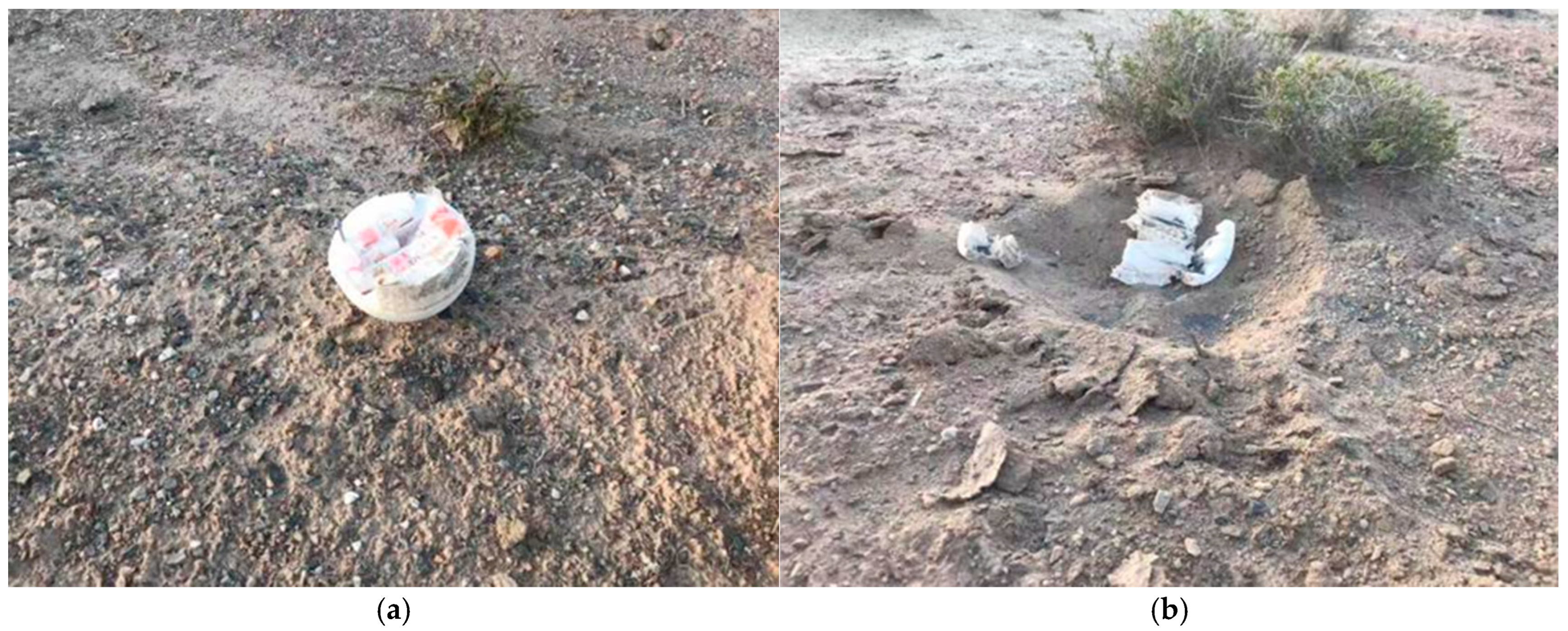 Post-recovery state of the simulated meteorites from HH-19-6: (a) intact unit; (b) shattered unit demonstrating high-impact forces.
