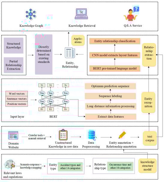 In research on knowledge extraction for the construction of knowledge graphs in early-stage construction safety, rule-based methods are generally employed [19]. For instance, in studies on the management of high-frequency, low-consequence general safety accidents, manually coded rules were utilized by Tixier et al. to extract domain attributes and entities from unstructured accident report texts [20]. With the continuous development of natural language processing technology, pre-trained models based on deep learning algorithms have begun to be applied to knowledge extraction [21]. Zhong et al. [22] employed a deep learning model combining BiLSTM and CNN to automatically extract construction process constraint knowledge from construction specification texts. Moon et al. [23] developed a named entity recognition model based on word vectors, through which key entities were extracted from construction specifications for construction safety management. Feng et al. [24] applied a BiLSTM-CRF model to extract accident information from accident investigation reports, and reliance on large-scale training datasets was reduced through a proposed data augmentation small-sample training framework. Xu et al. [25] applied the BERT-BiLSTM-CRF method to knowledge entity recognition in the field of coal mine construction safety, and higher accuracy than traditional methods was achieved.