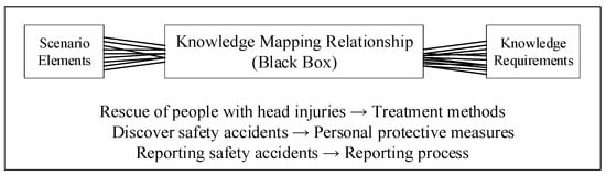 During the rapid emergency response to safety accidents, the necessary knowledge is transmitted quickly and in an orderly manner among various emergency response organizations. The process of emergency response knowledge mapping analysis, based on safety accident scenario elements, directly involves the analysis of knowledge requirements through the description of the accident scenario elements. An emergency response knowledge mapping system was established in this study to enable rapid knowledge provision. The principle of knowledge mapping is illustrated in Figure 3, and a detailed analysis of the mapping between scenario elements and emergency response knowledge is presented in Table 1. These mapping relationships facilitate the dynamic integration of knowledge, ensuring the precise alignment of situational elements with the most appropriate emergency response measures. For instance, during an incident, the identification of the accident and the assessment of its severity result in the mapping of relevant information to specific rescue protocols and resource requirements, such as the provision of medical equipment or the deployment of rescue gear. This knowledge mapping mechanism allows the knowledge graph to provide rapid, precise, and actionable information to field personnel, thereby significantly enhancing emergency response times and optimizing the overall efficiency of emergency management.
