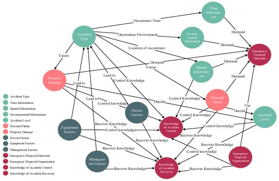 The scenario elements included in the accident events scenario domain consist of accident type, time information, spatial information, environmental information, and accident severity. The elements of the accident causation scenario domain comprise person factors, equipment factors, and management factors. The elements of the accident consequences domain include personal harm and property damage. The elements of the accident emergency activities domain cover the materials required for emergency response, the personnel organization responsible for executing emergency response, and the knowledge required to control and recover from the accident.