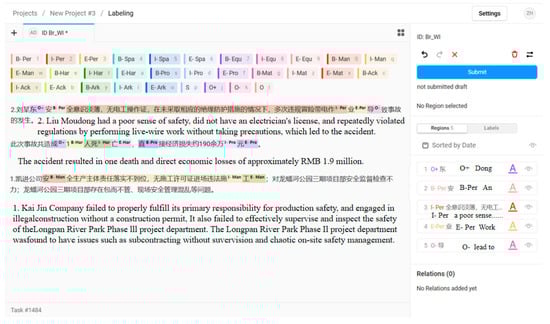 For data requiring entity extraction using deep learning models, the BIO + ES method was employed for annotation. This approach was designed to enhance annotation quality by introducing additional label types, thereby optimizing the training performance of subsequent models. Specifically, the boundary identifiers “O−” and “O+” were introduced to mark characters immediately adjacent to entities, rather than uniformly labeling all characters outside entities as “O”. In the actual annotation process, the Label-Studio platform was utilized to complete the data annotation work. The annotation category definitions are provided in Table 2. Label-Studio can collaborate with machine learning models to implement an automated labeling process, thereby reducing the burden of manual annotation and improving data processing efficiency. To ensure the consistency of the annotations, detailed training was provided to the annotators, ensuring that each annotator fully understands the specific meanings of each label. During the annotation process, a cross-validation method was employed, where two annotators independently annotated the same data, and the annotation results were compared to ensure the reliability of the annotations. Additionally, regular checks of the annotation results were conducted to ensure that the labeling of each entity category met the required standards. If any errors were identified, they were corrected through a feedback mechanism, and the relevant annotators underwent retraining to maintain ongoing accuracy in the annotations. Annotation examples are illustrated in Figure 5.