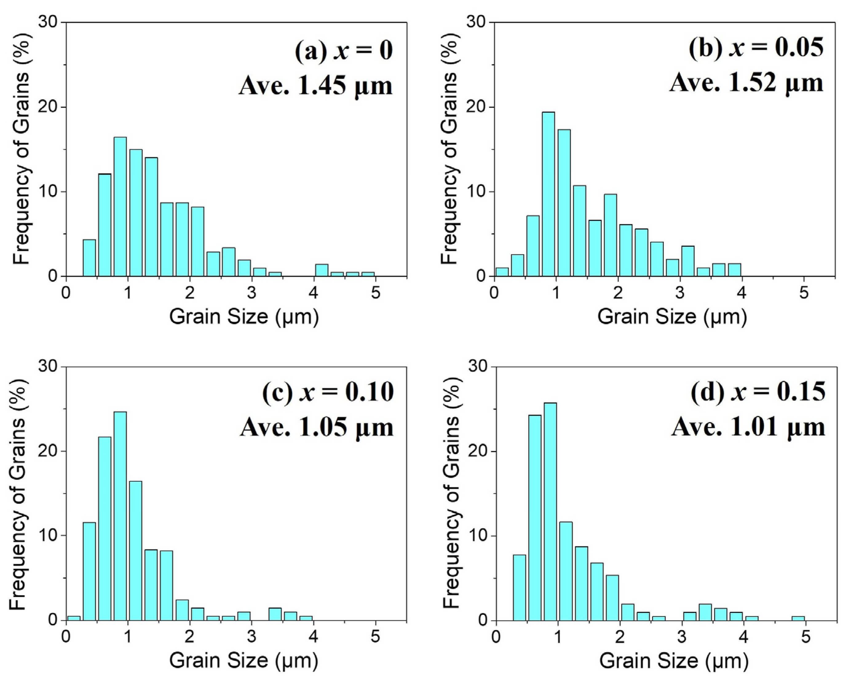 Figure 2a), the average grain size was 1.45 μm. With La–Mg substitutions, the average grain size slightly increased to about 1.5 μm at x = 0.05, while it was refined to around 1.0 μm at higher substitution levels of x = 0.1 and 0.15.