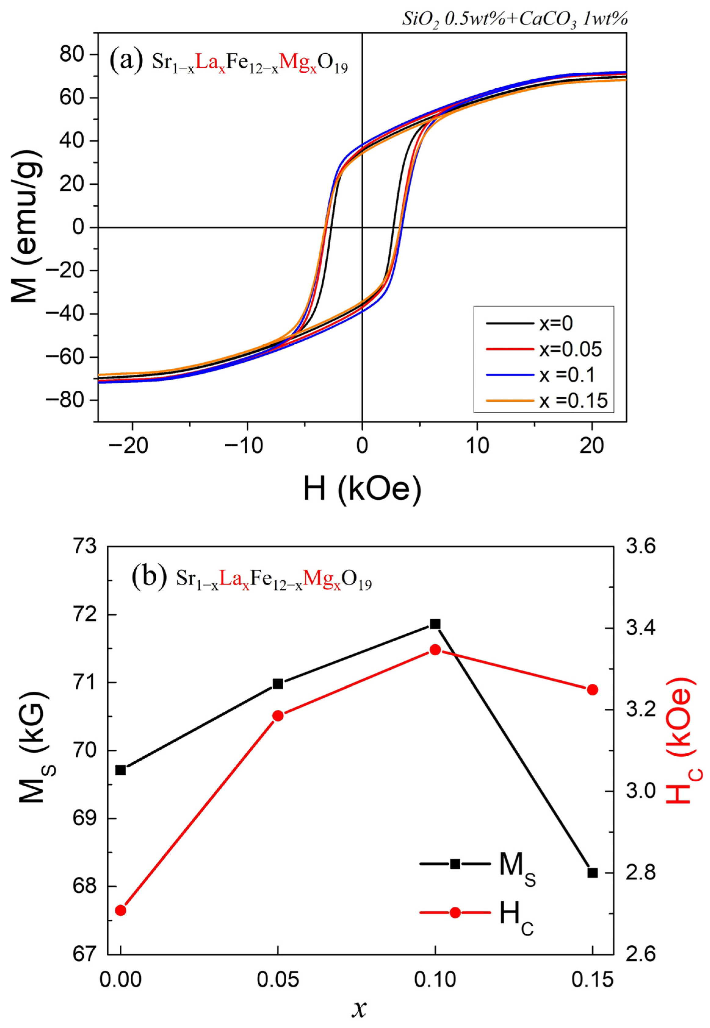 19 (x = 0, 0.05, 0.1, 0.15) samples. The specimens used for the VSM measurements were rectangular sintered bodies (~2.0 mm × ~1.5 mm × ~0.8 mm), and the magnetization (M) values represent the magnetic moment measured in emu normalized by the sample mass. In the VSM measurements, attention was focused on the intrinsic property of each cation-substituted sample—specifically, the variation in the M