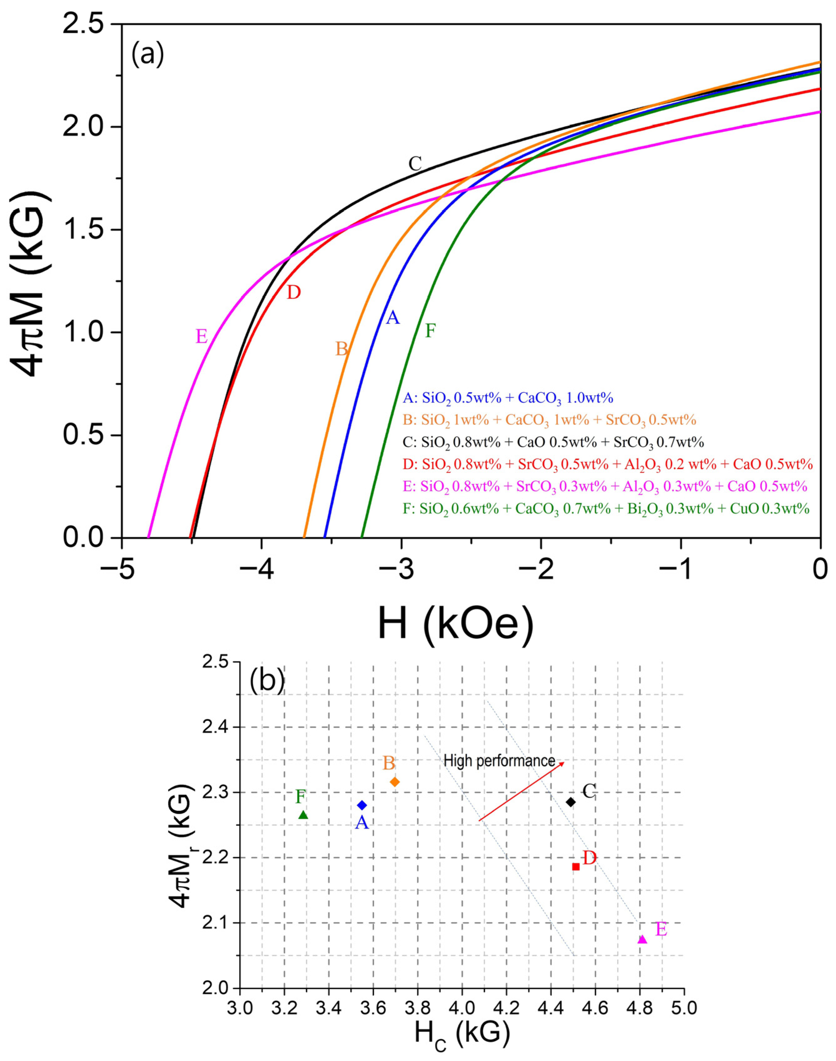 Figure 6a presents the demagnetization curves for samples prepared with six different combinations of sintering aids. Curve A represents the sample sintered with the original additives, 0.5 wt% SiO