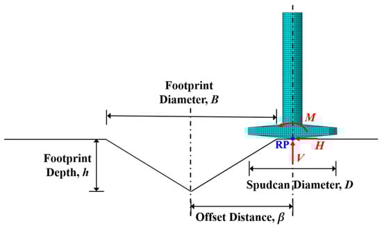 Currently, the research on spudcan–footprint interaction can be divided into two categories: centrifuge model tests and numerical simulations. As illustrated in Figure 1, the reinstallation of a spudcan near a pre-existing footprint involves several key geometric and mechanical parameters that govern the soil-structure interaction behavior. The offset distance (denoted as β) represents the horizontal separation between the center of the spudcan and the centerline of a previously formed footprint, where D is the spudcan diameter. Other important geometric features include footprint depth (h) and footprint diameter (B). In the process of reinstallation, due to the existence of footprints, the soil on both sides of the spudcan is obviously asymmetric, so that the bottom of the spudcan is subjected to vertical force (V), horizontal force (H), and moment (M), all acting at the reference point (RP) located at the center of the spudcan base. Based on centrifuge testing, Cassidy et al. [11] showed that the effect of footprints on the stability of the platform is most significant when the offset distance is 0.5D, and once the offset exceeds 1.5D, the effect becomes negligible. This 1.5D threshold was also confirmed by Yuan et al. [12] and Hendriyawan et al. [13]. Kong et al. [14,15] also used centrifuge tests to determine that 1D is the most unfavorable offset distance for reinstallation, and further revealed that both footprint depth and slope angle significantly affect the horizontal sliding force and moment acting on the spudcan. Fang et al. [16] used 1 g model tests to show that spudcan footprint infilling in loose sand prevents “stamp-on-void” hazards, especially effective at shallow depths (0.05D) and small offsets (≤0.25D), but diminishes at larger offsets or depths. Hatono et al. [17] found that the ABAQUS/CEL numerical simulation results are in good agreement with the centrifuge test data, and strongly recommended the use of numerical simulation as an effective tool to evaluate the spudcan-shoe interaction problem. The reliability of the CEL method has also been confirmed by other studies [18,19,20]. For example, using the CEL method, Yu et al. [21] pointed out that the friction condition strongly affects the horizontal force, but only has a slight effect on the moment. In addition, the flat-bottomed spudcan shows the lowest peak sliding force but the highest peak bending moment. Gao et al. [22] further applied the CEL method to evaluate the effectiveness of pre-drilled perforation holes in mitigating sliding risk during reinstallation near existing footprints. They reported that increasing the diameter, number and depth of boreholes can improve mitigation efficiency, although the improvement effect tends to be stable when the depth of boreholes exceeds twice the depth of footprints. Yu et al. [23] found that earlier near-side collapse induces negative lateral force during reinstallation; dual moment peaks result from uneven contact and asynchronous failure, with skirted footings performing best. Yu et al. [24] studied novel spudcan designs using CEL simulations, showing they reduce horizontal forces and bending moments compared to conventional ones, with the lotus-shaped design improving vertical capacity by 16.33%. Yang et al. [25] combined CEL simulations with machine learning to study spudcan reinstallation near footprints in spatially variable clay, revealing significantly increased failure risk under high variability conditions. However, the existing research on the reinstallation of jack-up drilling platforms next to footprints mainly focuses on single factor analysis, and there are still few systematic studies using orthogonal experimental design.