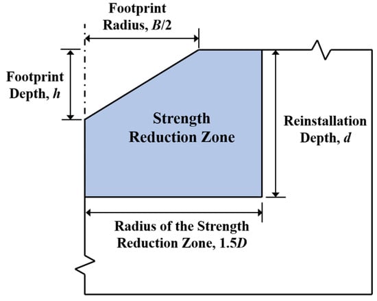 The Lagrangian reference geometry was established according to the shape of the reshaped footprint, and the volume fraction method was used to assign material properties to the soil outside the footprint. In addition, a cylindrical zone within a radius of 1.5D from the footprint centerline was defined as the strength reduction zone, in which soil strength was reduced according to the factors listed in Table 1. This zone extends vertically down to the reinstallation depth (d). The schematic diagram is shown in Figure 5.