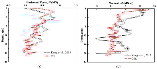 Comparison of simulated and centrifuge test results: (a) Horizontal force; (b) Moment. (Kong et al. [14]).