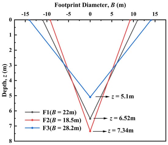 Three natural footprints with different geometric characteristics were selected and recorded as F1, F2 and F3, respectively, corresponding to the footprints formed by the extraction and subsequent remolding of the three different types of spudcans listed in Table 1. Their diameter and depth are shown in Figure 7. Numerical simulation is carried out under the same type of spudcan and offset distance, corresponding to Cases 1–3. Figure 8 illustrates the variation in vertical force, horizontal force, moment, inclination angle and displacement with the reinstallation depth in each case, and the peak values of these indicators are summarized in Table 3.