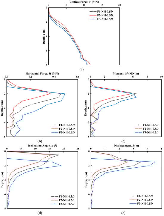 However, despite experiencing higher horizontal forces and greater moments, HY944 did not exhibit inferior stability performance. As shown in Figure 10d and Table 4, the peak inclination angle of HY944 is the smallest (15.125°), while the peak inclination angles of HY941 and NH-4 are 18.236 and 18.279°, respectively. Similarly, the maximum displacement follows the same trend, and HY944 shows the lowest value, reduced by 8.8% compared to HY941 (Figure 10e). This phenomenon can be attributed to the significantly higher vertical force of HY944, which helps to reduce the increase in lateral displacement despite the larger bending moment. In contrast, although HY941 and NH-4 have smaller bending moment and horizontal force, their lower vertical force leads to higher inclination angle and lateral displacement.