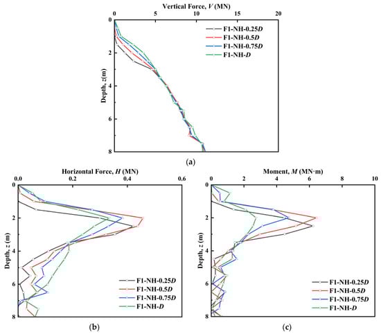 As shown in Figure 11b,c and Table 5, the influence of offset distance on horizontal force and moment is significant. As the offset distance increases from 0.25 D to 0.5 D, both H and M show an increasing trend, reaching a maximum at 0.5 D (moment is 6.428 MN·m, horizontal force is 0.457 MN). However, as the offset distance increases from 0.5D to D, both responses gradually decrease. This can be explained as that the asymmetric soil flow around the spudcan contributes significantly to the total horizontal force at a small offset distance. However, as the offset distance increases, the soil distribution around the spudcan tends to be symmetrical, resulting in a decrease in horizontal force and moment.