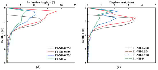 The inclination angle and lateral displacement were calculated based on the vertical forces for each case. According to Figure 11d,e, along with the data summarized in Table 5, when the offset distance increases from 0.25 D to 0.5 D, the inclination angle rises from 13.016° to 18.279°, and the displacement increases from 3.453 m to 3.512 m. Conversely, as the offset distance continues to increase from 0.5 D to D, both the inclination angle and displacement gradually decrease. Therefore, it can be concluded that the stability during reinstallation is worst when the offset distance is 0.5 D.