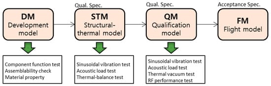 Figure 1 shows the general development process of a satellite and payload. In the development model (DM) process, functional tests of each component from a mechanical point of view and assembly reviews are performed. In the structural–thermal model (STM) stage, launch environment tests are performed to evaluate the structural integrity against vibration and acoustic loads, and thermal environment tests are performed to simulate thermal loads and evaluate the response in the thermal environment. A qualification model is designed and manufactured using the results of the environmental tests performed in the STM stage. The qualification model (QM) is a model that provides the same functions and performance as the flight model (FM) and is tested for the orbital environment, such as in the structural environment tests and thermal vacuum tests performed in the STM stage [].