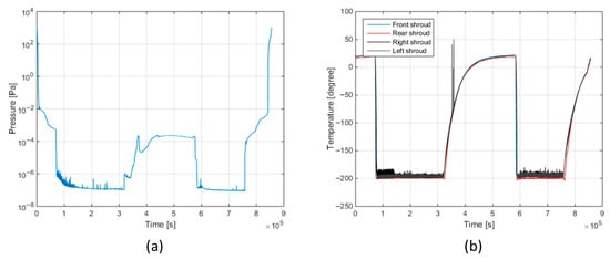 Vacuum chamber condition during the thermal balance test; (a) chamber pressure condition; (b) chamber temperature condition.