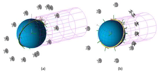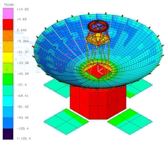 Thermal analysis-assumed orbital environment of large satellite reflector antennas is an essential process for predicting the thermal environment for a satellite’s mission orbit and evaluating how a deployable reflector antenna will react to various environmental conditions in orbit [,]. The results derived from this process focus on mimicking the extreme temperature environments that a deployable reflector antenna may face and evaluating its structural and thermal stability in high and low temperature conditions. It is also the first step in securing the basis data to be used for predicting the temperature distribution of the deployable reflector antenna and, together with the associated material thermal expansion coefficient, for thermal deformation analysis of the deployable reflector antenna and antenna directivity analysis for the thermal deformation results.