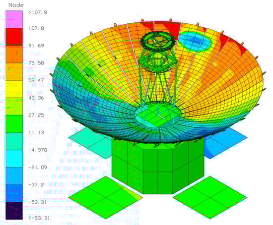 The results of the worst hot case during the thermal analysis are shown in Figure 12 and Figure 13 and Table 13. Figure 12 shows the temperature distribution of the deployable reflector antenna in the worst hot case. Figure 13 shows the temperature distribution of the satellite and the deployable reflector antenna in the worst hot case, with the satellite BUS specified as the boundary condition. The resulting temperature distributions are listed under “Predict temperature” in Table 13 for each component. If a component’s predicted temperature falls within the minimum–maximum range indicated for the operating temperature, it is marked as Pass.