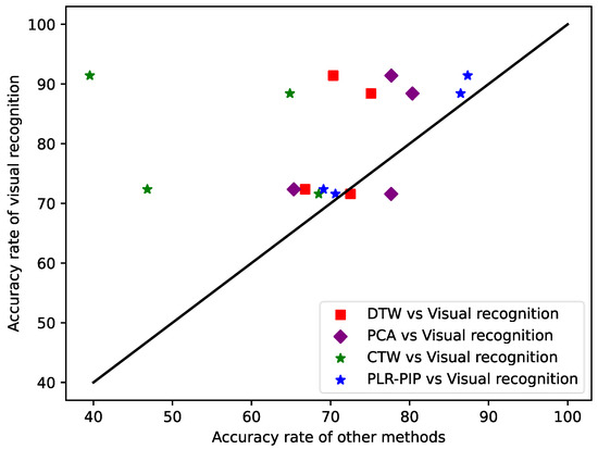 We compared the recognition accuracy of the visual recognition method with that of previous methods, such as DTW, PCA, CTW, and PCR-PIP, using the same dataset, and plotted the 1-NN graph in Table 1 and Figure 3. Compared with the comparison methods, the visual recognition method proposed in this paper has significant advantages in the recognition accuracy of flight maneuvers.