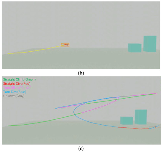 In terms of visualization, a color mapping scheme is employed to represent different flight maneuvers, where green, purple, red, orange, and gray correspond to straight climb, turning climb, straight dive, turning dive, and unrecognized maneuvers, respectively. The current maneuver type, along with a legend, is displayed in real-time within the video frames. Some trajectories (grey segments) in Figure 4c remain unrecognizable due to the limitation of visual recognition for maneuver segments—which only allows analysis from the main perspective. When the aircraft flies at the same horizontal level, the specific maneuver type cannot be determined, so these trajectories are classified as level flight or level turn.