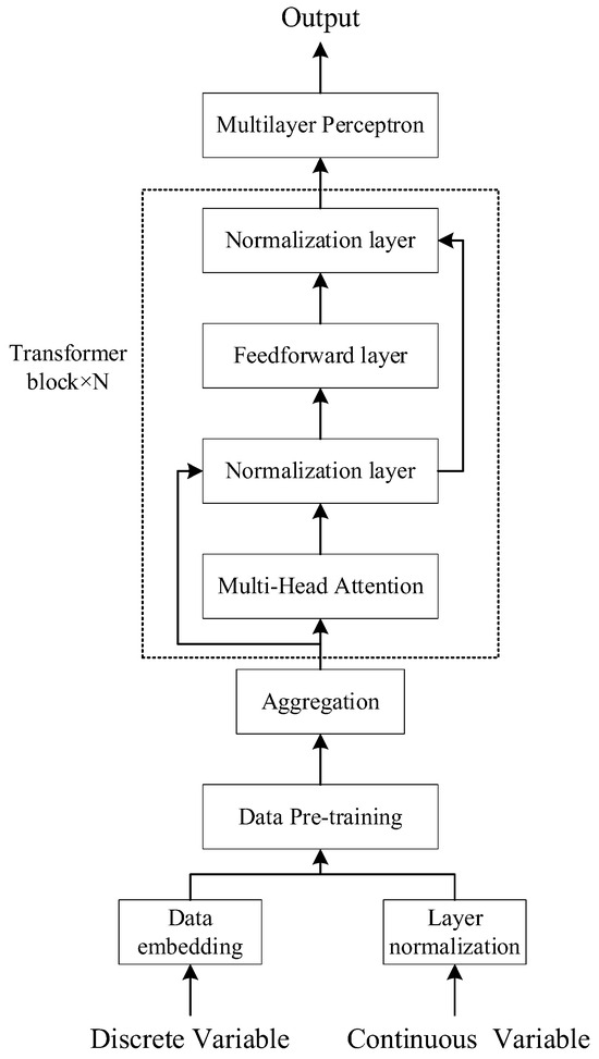 To address issues such as insufficient temporal feature capture and poor data adaptability of the traditional Transformer model in aircraft load prediction, improvements are made from three aspects: in terms of the attention mechanism, a convolutional self-attention mechanism is introduced, where Query and Key are preprocessed through 1D convolution operations to fuse local temporal features, thus enhancing the prediction accuracy of load extreme points; in terms of data input, a linear transformation layer is used to map continuous flight parameters to a vector space with a unified dimension, and at the same time, a dual-dimensional positional encoding including feature dimension encoding and relative importance is designed to adapt to the characteristics of flight parameters; in terms of model architecture, the decoder is removed and a linear regression layer is connected to reduce computational complexity, and a masked feature learning pre-training module is also added to improve the model’s generalization ability under the condition of limited flight data. The architecture diagram of the improved model is shown in Figure 5.