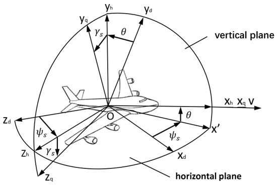 Based on the relationship between wind coordinate (system with subscript q), flight path coordinate system (system with subscript h), and ground coordinate system (system with subscript d) in Figure 8, the dynamic differential equations of the aircraft’s centroid can be derived using the transformation matrix between the body coordinate system and the flight path coordinate system: