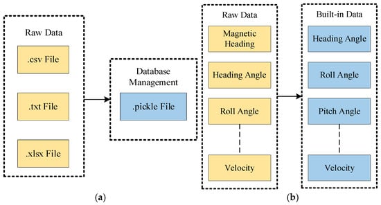 Currently, supporting diverse imported file formats and ensuring good compatibility has become a mainstream trend. As shown in Figure 10a, formats such as .csv, .xlsx, and .txt are all converted into pickle files. Converting data to pickle files has notable advantages: as an efficient binary serialization format in Python, it effectively stores various data types, supports cross-platform compatibility, offers good compression, takes up minimal storage space, and is especially critical for large-scale flight parameter data. Additionally, since different aircraft types record different data, the same type of data may have different names (for example, the heading angle may be called magnetic heading in different datasets, and the roll angle may be referred to as bank angle). To enable quick identification and comparison of data from different aircraft types, the software has built-in some universal flight parameter names, as illustrated in Figure 10b. When inputting flight parameter data, the data to be saved is correlated with the software’s built-in universal flight parameters, thereby improving the overall consistency of the data.