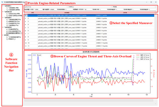 Based on the calculation logic of engine required thrust, the Engine Thrust Calculation Platform establishes dynamic equations according to the aircraft’s current state, combined with the design parameters and initial state of different aircraft models. The interface of the thrust estimation platform is shown in Figure 13. Finally, it calculates the target value of engine thrust required to maintain the current flight state and visualizes the results.