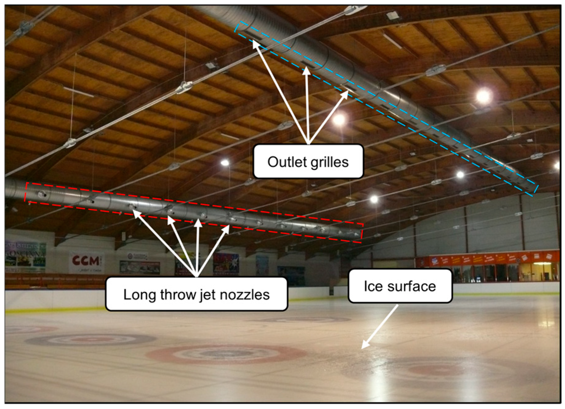 The analysed ice rink arena has dimensions of 66 m in length, 37 m in width, and 11 m in height at the highest point of the roof, resulting in a total volume of approximately 22,100 m3. Figure 2 presents an interior view of the facility with the locations of exhaust grilles and supply openings designed as long throw jet nozzles. The ice surface, measuring 30 m × 60 m, is also visible in Figure 2.