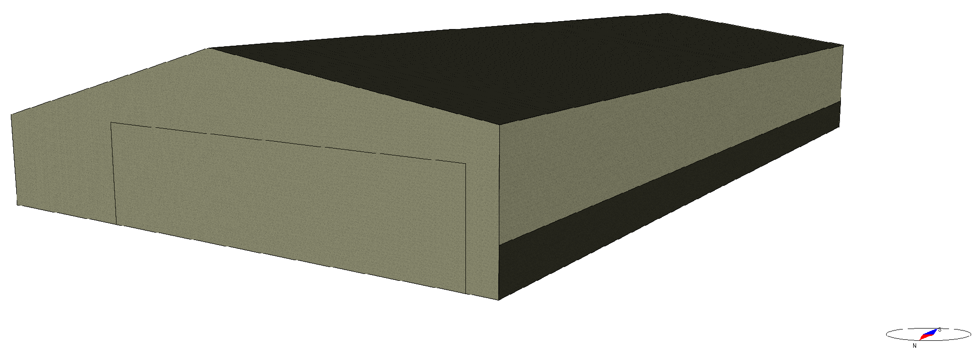 For the purposes of energy simulations, a model of the analysed ice rink arena was created in IDA ICE 4.8 (Indoor Climate and Energy) software, as shown in Figure 3. The model was based on the actual dimensions of the facility according to its technical documentation. For simplification, two inclined roof planes were assumed instead of the actual arched roof shape, in order to preserve the arena’s volume, and the inclination of the western wall was omitted, which does not significantly affect the results of the analyses.