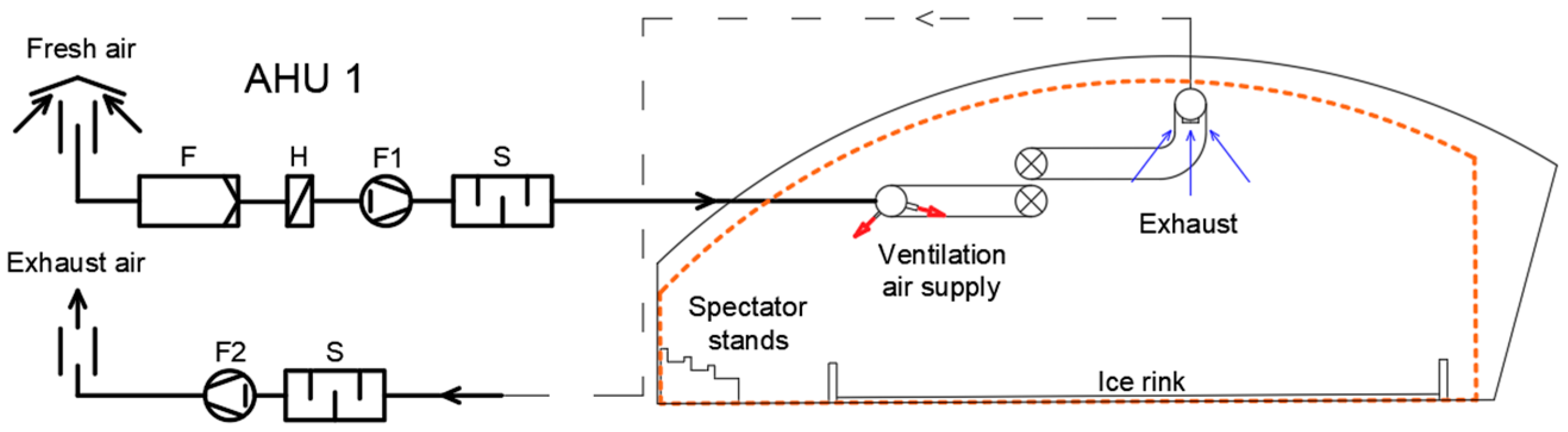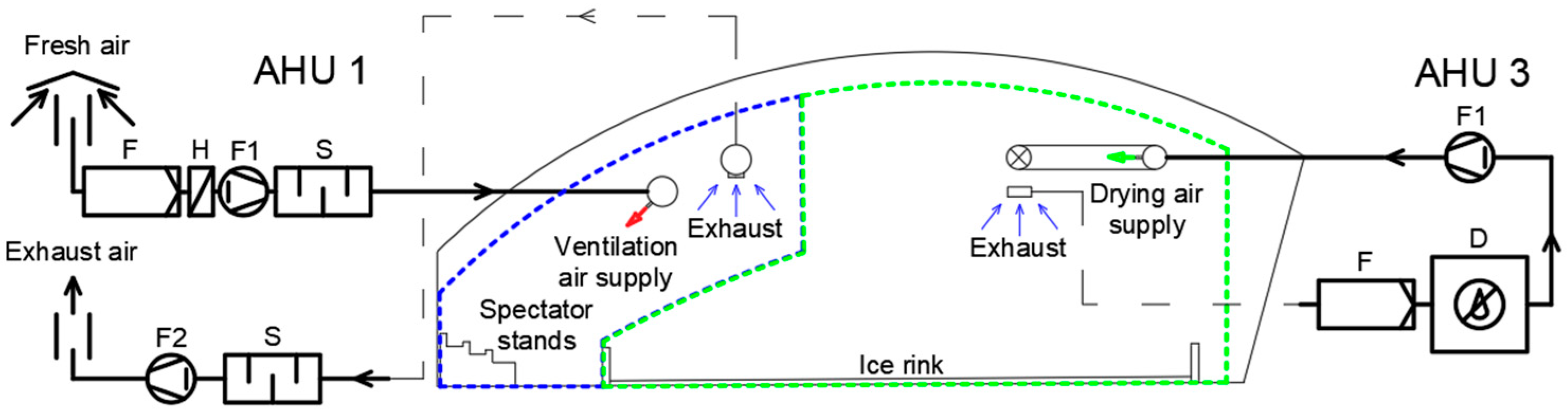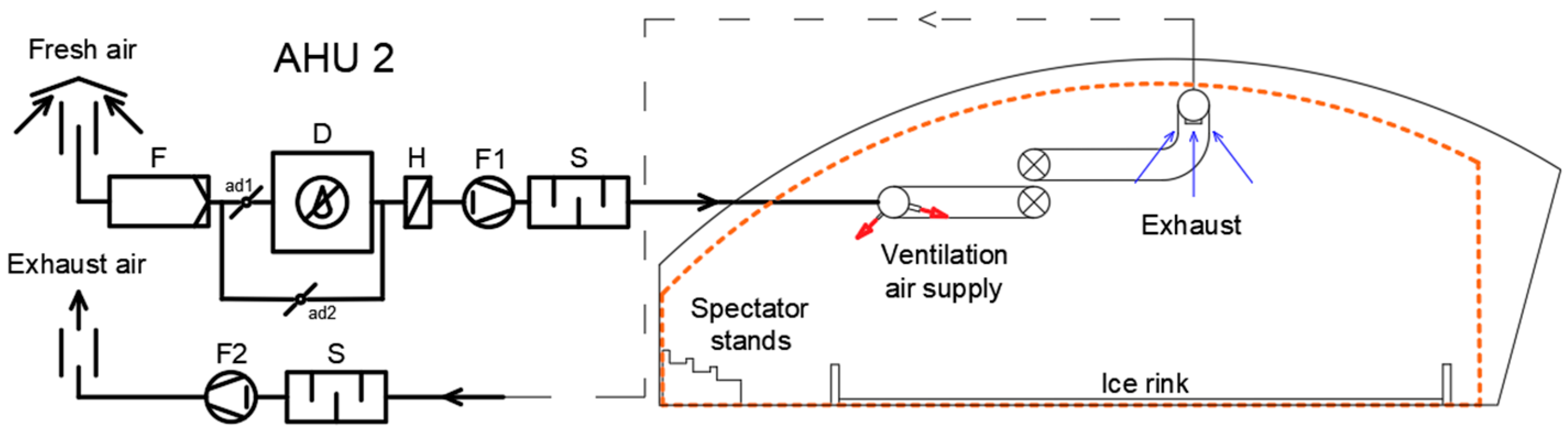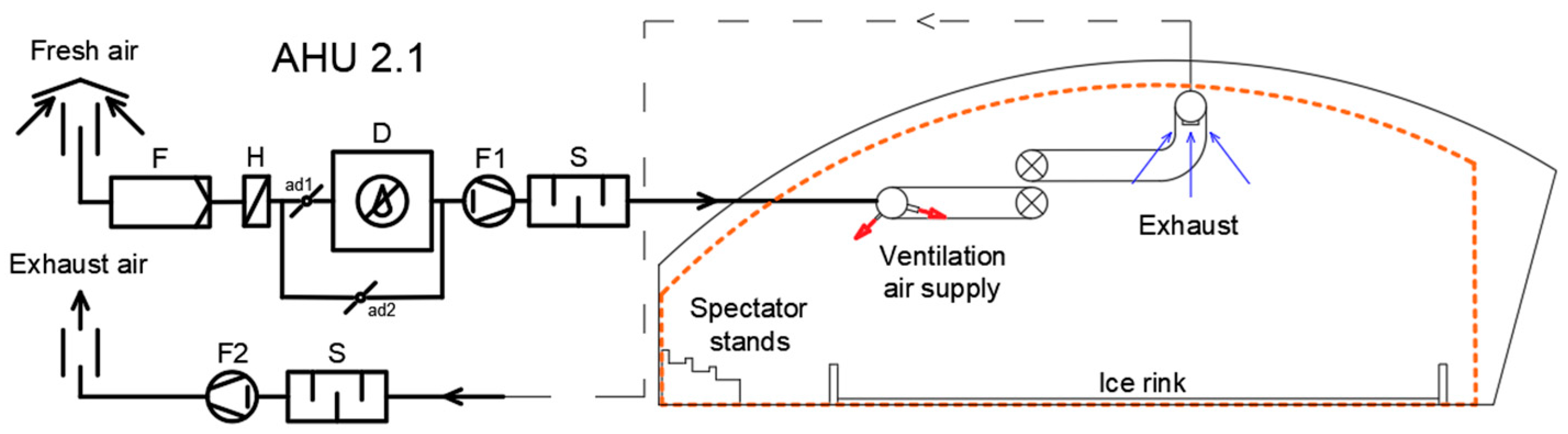 Air can be supplied to an ice rink arena in different ways. Two types of air distribution systems are commonly used in ice rink arenas [5,7]. The integrated system combines the functions of ventilation, heating, and dehumidification within a single installation. In this case, the ice rink together with the spectator area is treated as a single zone, where supply air, both heated and dehumidified, is delivered, for example, through long-throw nozzles mounted beneath the roof structure. This solution is preferred for facilities with small spectator areas and a limited number of viewers. In the separated system, the functions of ventilation/heating are independent from those of dehumidification. The arena is divided into two zones: the ice rink and the spectator area. Each of these is provided with a separate supply air system, for example, through long-throw nozzles in the upper part of the arena, together with dedicated exhaust air outlets. In the spectator zone, heated supply air is introduced to ensure thermal comfort for relatively inactive occupants. The air should be directed so as not to flow over the ice surface, as this could contribute to fog formation above the ice rink. The air supplied to this zone consists of 100% outdoor ventilation air. In contrast, in the zone adjacent to the ice surface, air is drawn from the arena, dehumidified in the air handling unit, and subsequently resupplied to the arena in order to protect the ice surface from the adverse effects of moist air. Designers are familiar with the recommendation [7] that the dehumidification airflow should account for 7–10% of the ventilation airflow, although this guideline lacks a clear justification, other than the need to limit heat exchange between the ice surface and the indoor air.