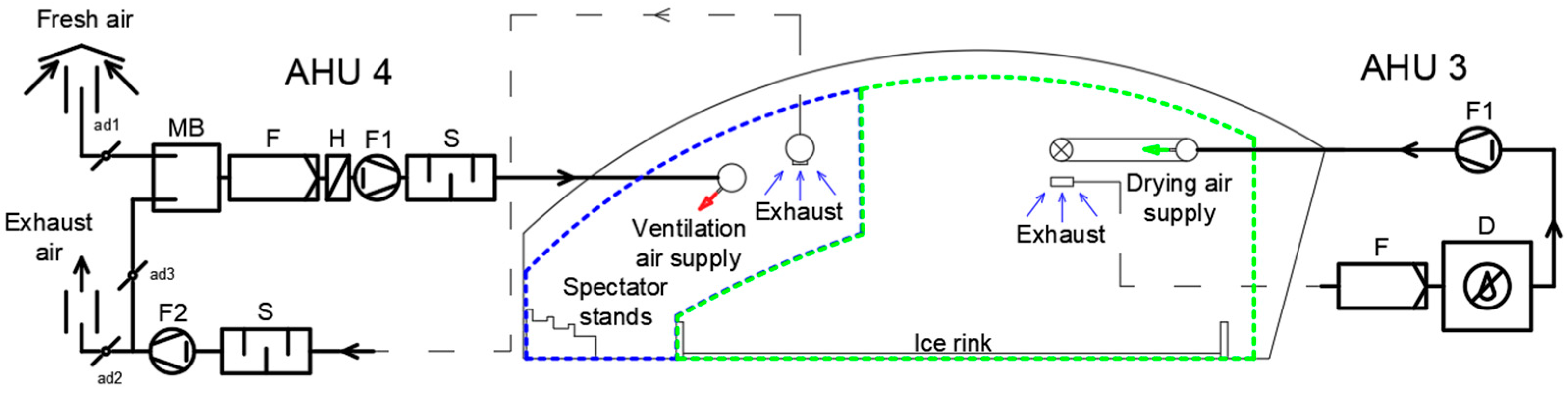 Variants 1 and 2 were based on the existing Constant Air Volume (CAV) system in the actual facility, with ventilation air volume flow rates set according to the experimental data for the respective fan speeds. In these variants, outdoor air is supplied to AHU 1, where it is heated in a heating coil to the appropriate supply air temperature depending on the outdoor air conditions, and then delivered to the arena through the integrated air distribution system. No air dehumidification is provided.