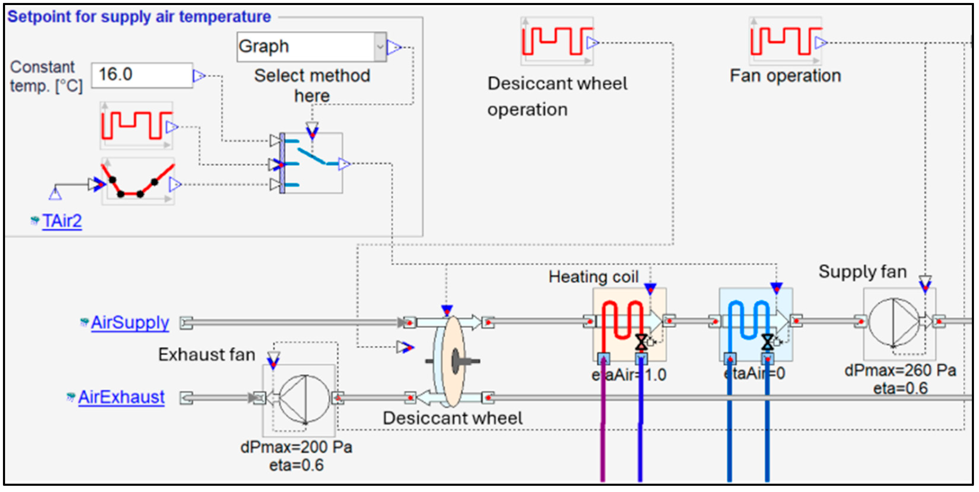 A sample schematic of the air handling unit defined in IDA ICE 4.8 for Variant 3 is shown in Figure 11. For all variants, the supply and exhaust fans were assigned the same pressure based on the design of the ice rink ventilation system. The fan efficiency was also assumed to be identical across all variants, so that the Specific Fan Power (SFP) did not exceed the maximum allowable values specified in the Polish regulations [23]. In IDA ICE 4.8, the fan efficiency was set at 60%, and this was accounted for in the calculations. Differences in the average energy consumption of the fans due to varying air volume flow rates between variants amount to a maximum of 16% of the fan energy, which corresponds to approximately 0.5% of the total energy consumption for the analysed variants. This difference was included in the IDA ICE 4.8 calculations; however, it was not further discussed in the analysis, as it does not affect the overall results of the study. The values of fan pressure, efficiency of the supply and exhaust fans, and their SFP values are presented in Table 2.